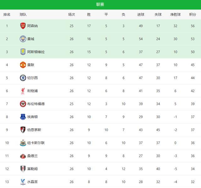 英超第26轮多家朱门联手出击,名次老二的曼城3-0完胜富勒姆,全取3分接续给阿森纳施加压力;老三的阿斯顿维拉1-0险胜布莱顿,紧紧抢占第三;赤军利物浦客场1-0桑德兰,卫冕冠军为欧冠席位发起冲击;其他比赛,诺丁汉丛林主场0-0被副班长狼队逼平;水晶宫主场2-3爆冷不敌伯恩利,后者拿下保级伟业的第4场顺利。当今联赛争冠、争四的积分皆咬得额外紧,一场比赛的赢输,将平直更新积分榜的大部分位置,额外的刺激!